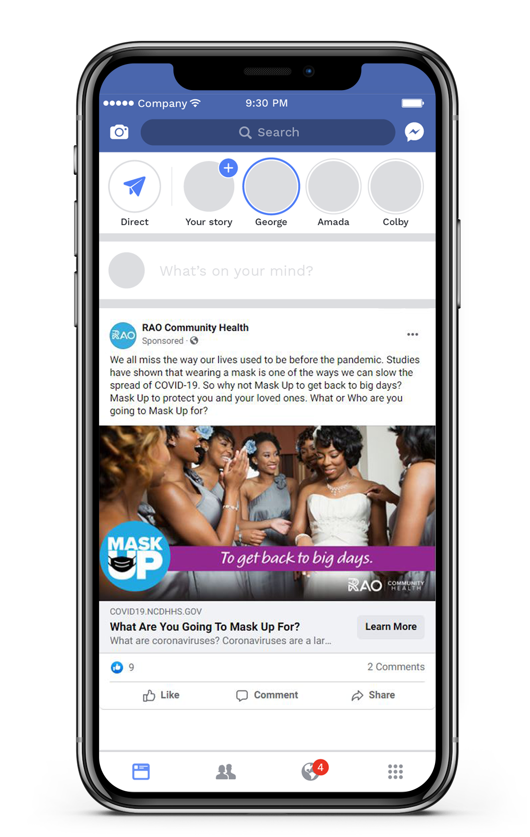 In response to the COVID-19 pandemic, the North Carolina Department of Health and Human Services' Office of Minority Health developed a COVID-19 grant for organizations to promote the 3 W's - Wear, Wash, & Wait - in the Black/African American community. The "Mask Up" campaign was created to encourage mask usage with five message themes: major milestones, family vacations, big days, girls' trips, and first meetings. The campaign consisted of paid social media and display banner ads.